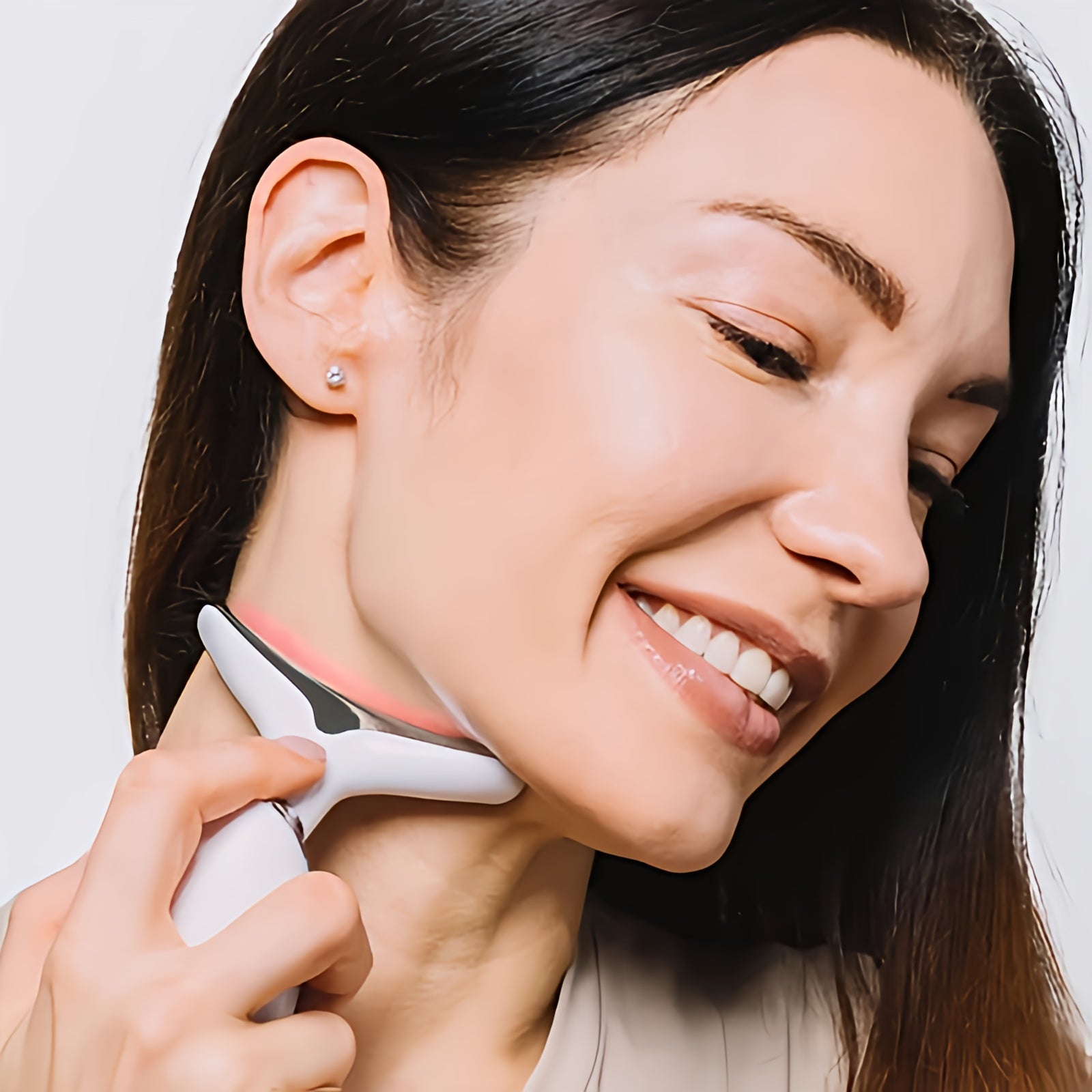 Utilisez ensuite le Skinlift en sélectionnant la lumière LED adaptée à vos besoins, en faisant glisser l’appareil du bas vers le haut du visage pendant 10 minutes.
